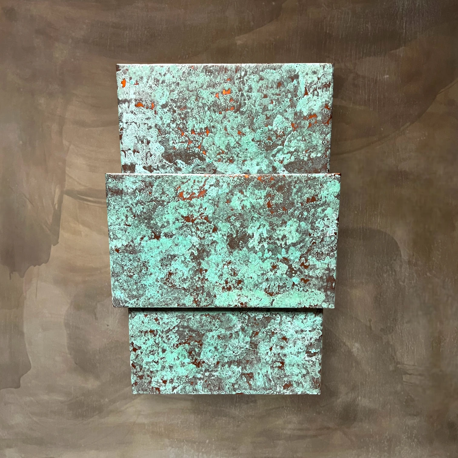The SW Green Rectangular Wall Sconce is a handcrafted Southwestern style light made in New Mexico. Custom produced from copper metal, this wall sconce features a distinctive three-tier design and a custom green finish, bringing authentic Southwest charm and artisan craftsmanship to any indoor or outdoor space.